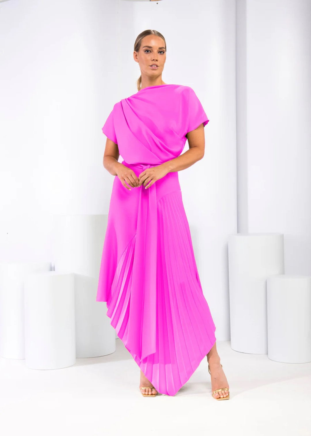 Stunning Kevan Jon Mila pleat dress in Barbie Pink. Featuring a striking asymmetrical pleat hem, drop shoulder neckline and tie belt.